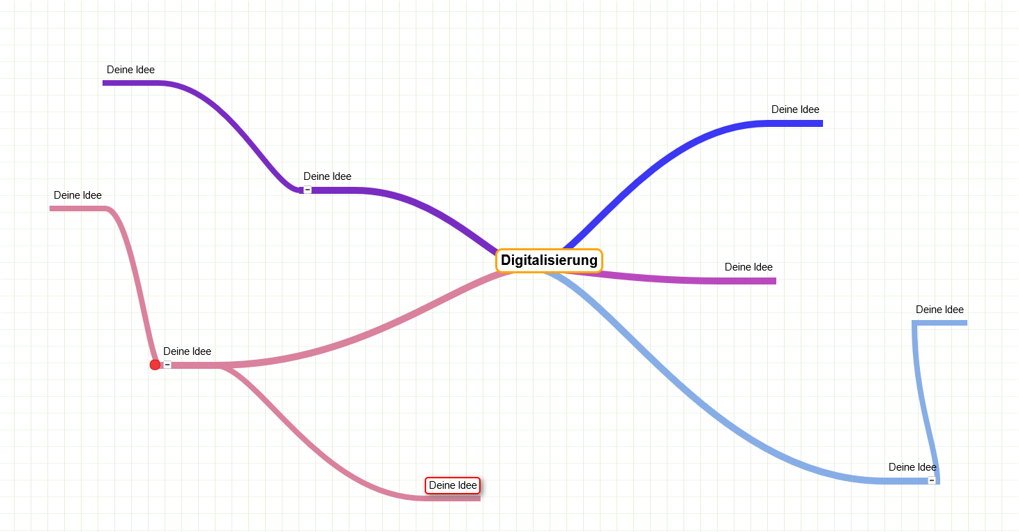 In der Mitte steht der Schlüsselbegriff (Digitalisierung). Von diesem Mittelpunkt aus verbindest du mit Linien Begriffe und Ideen, die zum Thema passen:
