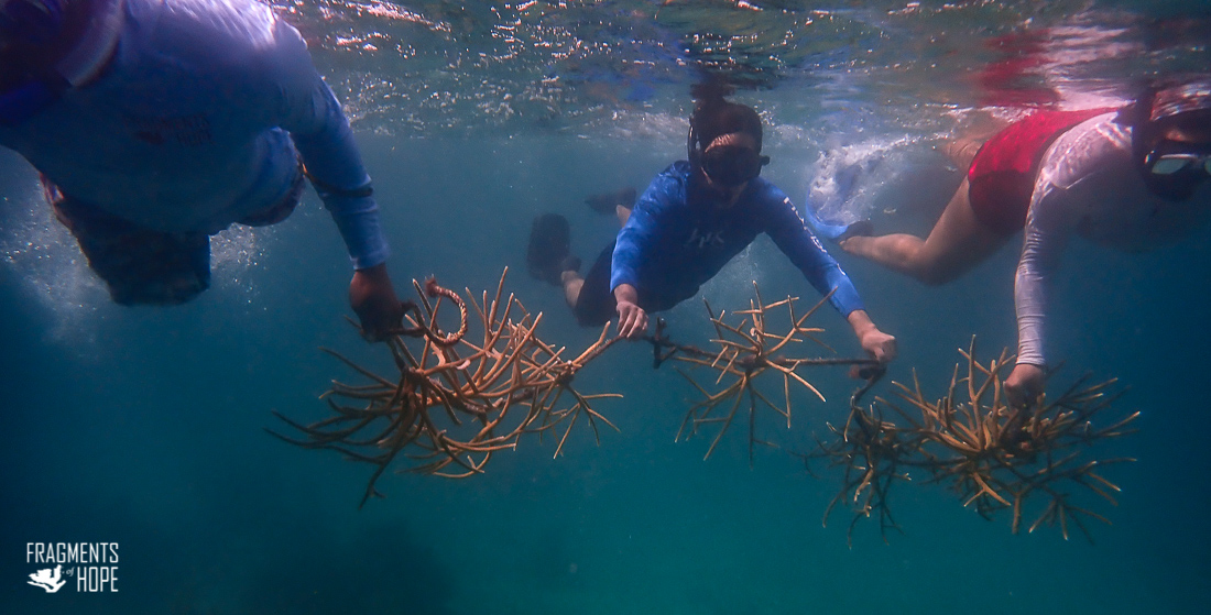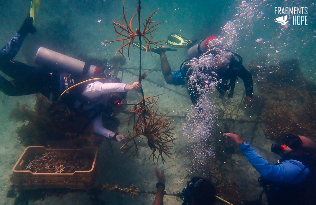 Das Team von Fragments of Hope hat zusammen mit der örtlichen Gemeinde mehr als 10 Jahre damit verbracht, zahlreiche Korallenfragmente zu pflanzen, um das Riff neu zu beleben. Dazu wurden Fischer*innen, Taucher*innen und Schnorchler*innen darin geschult, die Korallen zu „pflanzen“.